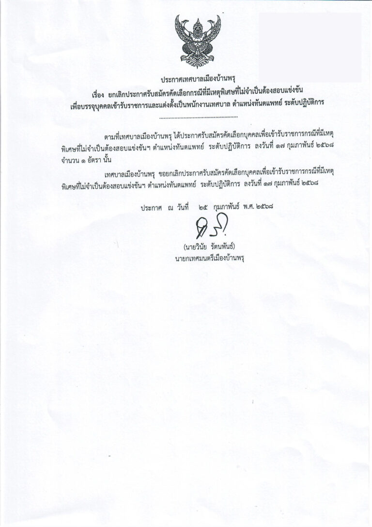 ข่าวประชาสัมพันธ์ ยกเลิกประกาศรับสมัครคัดเลือกกรณีที่มีเหตุพิเศษที่ไม่จำเป็นต้องสอบแข่งขันเพื่อบรรจุบุคคลเข้ารับราชการและแต่งตั้งเป็นพนังานเทศบาล ตำแหน่งทันตแพทย์ ระดับปฏิบัติ26 กุมภาพันธ์ 25685 มีนาคม 2025