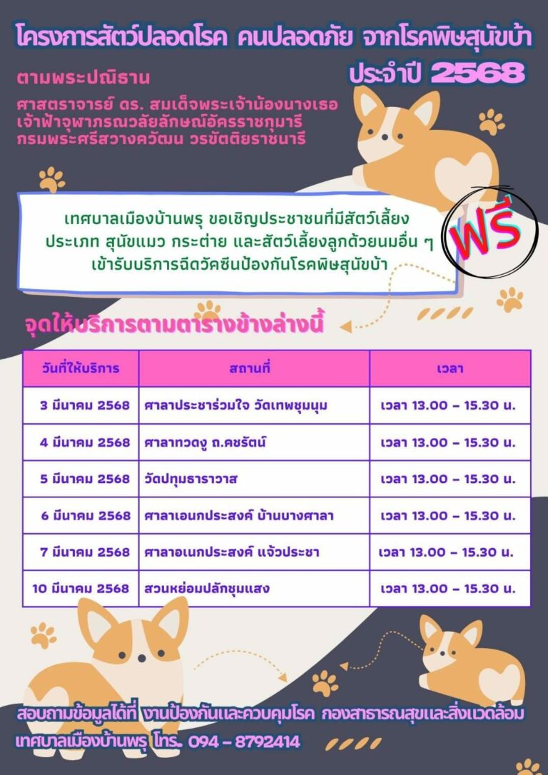 ข่าวประชาสัมพันธ์ เทศบาลเมืองบ้านพรุ ขอเชิญชาวบ้านพรุพาสัตว์เลี้ยงของท่านไป รับบริการฉีดวัคซีนป้องกันโรคพิษสุนัขบ้า ตามสถานที่ในวันและเวลาดังต่อไปนี้18 กุมภาพันธ์ 256818 กุมภาพันธ์ 2025