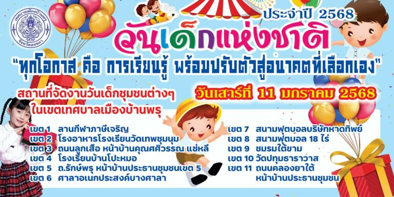 ข่าวประชาสัมพันธ์ ขอเชิญร่วมงานวันเด็กแห่งชาติ ปี 2568 วันเสาร์ที่ 11 มกราคม 2568 ณ สถานที่จัดงานวันเด็กทั้ง 11 ชุมชน ในเขตเทศบาลเมืองบ้านพรุ7 มกราคม 25688 มกราคม 2025
