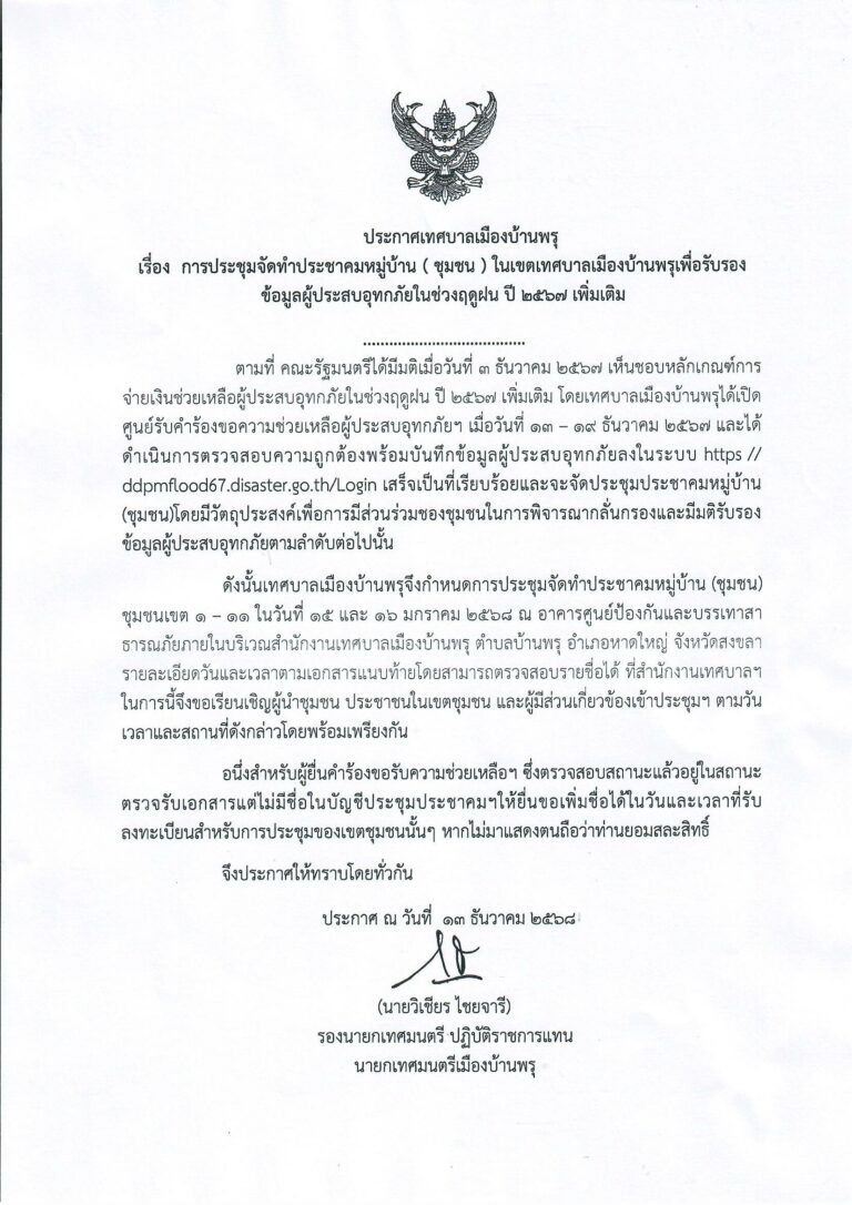 ข่าวประชาสัมพันธ์ กำหนดประชุมประชาคมหมู่บ้าน ขอรับความช่วยเหลือผู้ประสบอุทกภัยภัยในช่วงฤดูฝน ปี 256710 มกราคม 256813 มกราคม 2025
