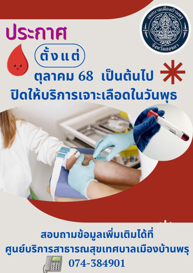 ข่าวประชาสัมพันธ์ 📣 ประกาศ 📣ตั้งแต่ ตุลาคม 2568 เป็นต้นไป🏥 แจ้ง เปลี่ยนการให้บริการเจาะเลือด เป็น วันจันทร์ และ วันพฤหัสบดี ตั้งแต่เวลา 06.30 น. – 09.00 น.สอบถามข้อมูลเพิ่มเติมได้ที่ ศูนย์บริการสาธารณสุข เทศบาลเมืองบ้านพรุ โทร 074-38490115 กันยายน 256815 กันยายน 2025