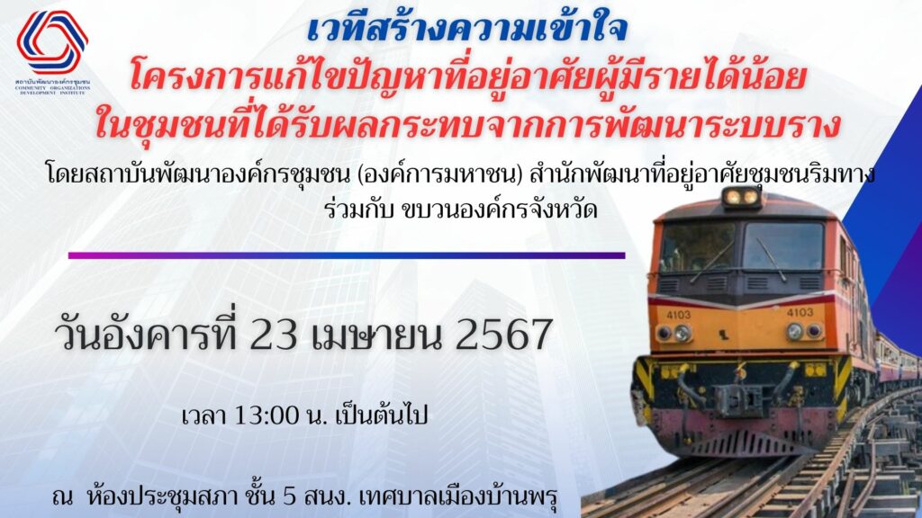 สถาบันพัฒนาองค์กรชุมชน (องค์การมหาชน) สำนักพัฒนาที่อยู่อาศัยชุมชนริมทาง ร่วมกับ ขบวนองค์กรจังหวัด #ขอเชิญชวนผู้นำชุมชน คณะผู้บริหาร สมาชิกสภาเทศบาล #และประชาชนที่อาศัยอยู่บริเวณริมทางรถไฟบ้านพรุทั้งซ้าย-#ขวา #เพื่อร่วมเวทีสร้างความเข้าใจ #การดำเนินการโครงการแก้ไขปัญหาที่อยู่อาศัยผู้มีรายได้น้อยในชุมชนที่ได้รับผลกระทบจากการพัฒนาระบบราง เพื่อสร้างความมั่นคงในการอยู่อาศัยมีโครงสร้างพื้นฐาน ระบบสาธารณูปโภค สิ่งแวดล้อมที่ดี มีรูปแบบการพัฒนาที่สอดคล้องกับวิถีชีวิตและพัฒนาคุณภาพชีวิตทุกมิติ ในวันอังคาร ที่ 23 เดือนเมษายน พ.ศ. 2567 เวลา 13.00 น. เป็นต้นไป ณ ห้องประชุมสภาเทศบาลชั้น 5 เทศบาลเมืองบ้านพรุ อำเภอหาดใหญ่ จังหวัดสงขลา