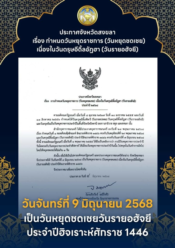 ดังนั้น เพื่อให้เป็นไปตามมติคณะรัฐมนตรี และประกาศจุฬาราชมนตรีดังกล่าว จังหวัดสงขลา จึงประกาศให้ วันจันทร์ที่ ๙ มิถุนายน ๒๕๖๘ เป็นวันหยุดราชการ (วันหยุดชดเชย) เนื่องในวันตรุษอีดิ้ลอัฏฮา (วันรายอฮัจยี) ประจำปีฮิจเราะห์ศักราช ๑๔๔๖