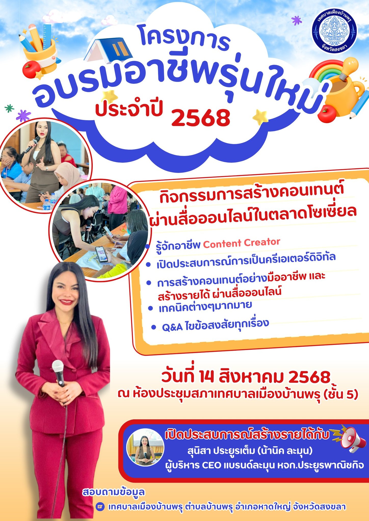 🎉มาแล้วจ้า..เปิดโอกาสให้คนรุ่นใหม่ สร้างคอนเทนต์ สร้างอาชีพ สร้างรายได้ ผ่านสื่อออนไลน์🎉 ใน ✨️โครงการอบรมอาชีพรุ่นใหม่ ประจำปี 2568✨️