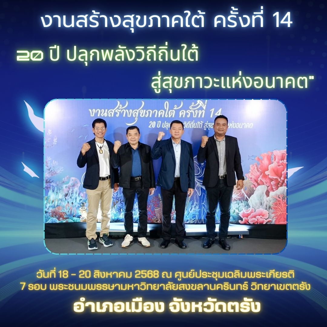 🇹🇭เวทีภาคใต้แห่งความสุขครั้งที่ 14 จะเป็นอีกการรวมพลังคนใต้อีกครั้ง ที่ พี่น้องเครือข่ายจะได้มา โชว์ แชร์ เชื่อม ชู๊ท ชาร์ท ทำให้เวทีสร้างสุขภาคใต้ เป็นเวทีที่มีความหมายของคนใต้ ให้เป็นกระบวนการที่มีเป้าหมาย สานพลังภาคีเครือข่าย แลกเปลี่ยนเรียนรู้การขับเคลื่อนประเด็นสุขภาวะของภาคใต้ ไปสู่กระบวนการนโยบายสาธารณะ ที่เกิดการสานพลังขับเคลื่อนในลักษณะข้ามประเด็นพื้นที่ เพื่อความสุขคนใต้อย่างแท้จริง มุ่งสร้างอนาคตสู่ความยั่งยืนของพื้นที่ภาคใต้ไปด้วยกัน
