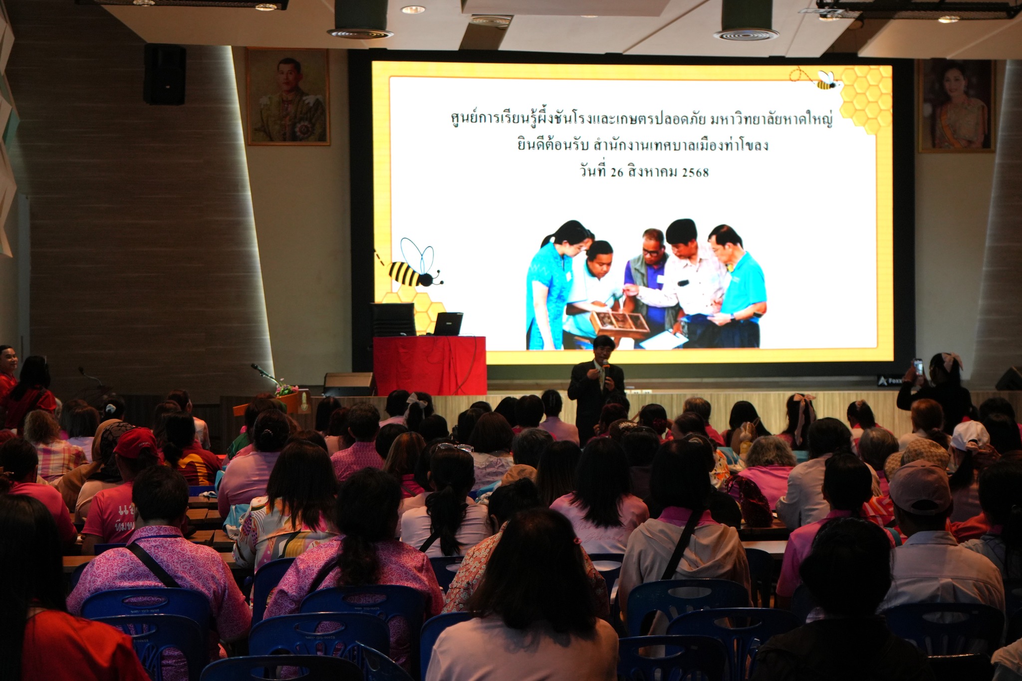 🚩วันที่ 25 สิงหาคม 2568 เวลา 09.00 น. ณ ห้องประชุม Blue Ocean Hall ชั้น 2 คณะบริหารธุรกิจ มหาวิทยาลัยหาดใหญ่ นายอดินันท์ หนูอุไร นายกเทศมนตรีเมืองบ้านพรุ พร้อมคณะผู้บริหาร สมาชิกสภาเทศบาล หัวหน้าส่วนราชการ และเจ้าหน้าที่ที่เกี่ยวข้อง ร่วมกับผู้บริหารมหาวิทยาลัยหาดใหญ่ นำโดย ผศ.ดร.นิวัตน์ สวัสดิ์แก้ว รองอธิการบดีฝ่ายพัฒนานักศึกษาและชุมชนสัมพันธ์ ร่วมต้อนรับนายสมหมาย โสนามิตร รองนายกเทศมนตรีเมืองท่าโขลง จังหวัดปทุมธานี และคณะกรรมการพัฒนาสตรีเทศบาลเมืองท่าโขลง ที่ได้เดินทางมาศึกษาดูงานการเลี้ยงผึ้งชันโรง เพื่อศึกษาเรียนรู้การเลี้ยงผึ้งชันโรง และแบ่งกลุ่มฝึกปฏิบัติจริง สามารถนำความรู้ที่ได้ไปปรับใช้ในการเสริมสร้างอาชีพ สร้างรายได้ในครัวเรือนต่อไป