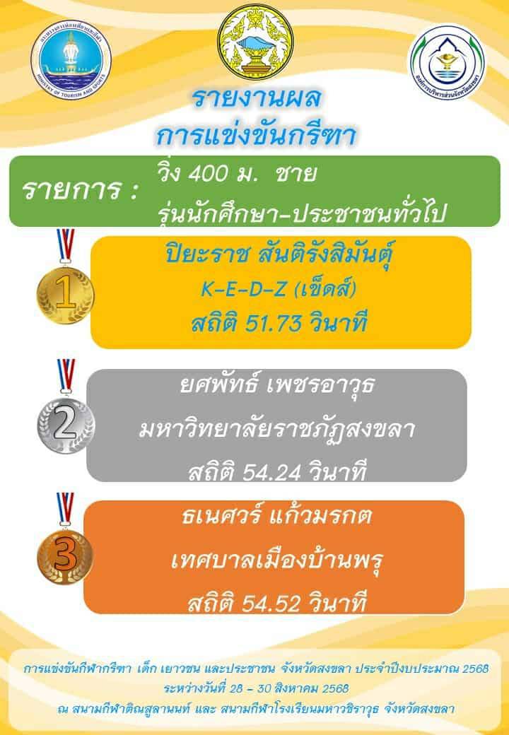 🎯 ผลการแข่งขัน วิ่ง 400 ม. ชาย [รุ่นนักศึกษา-ประชาชนทั่วไป]