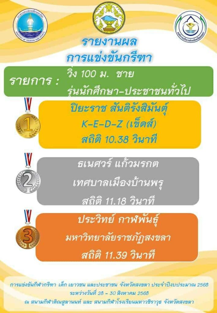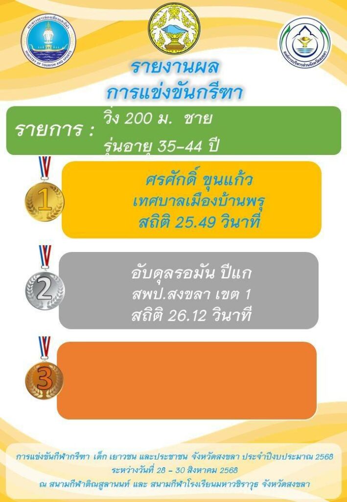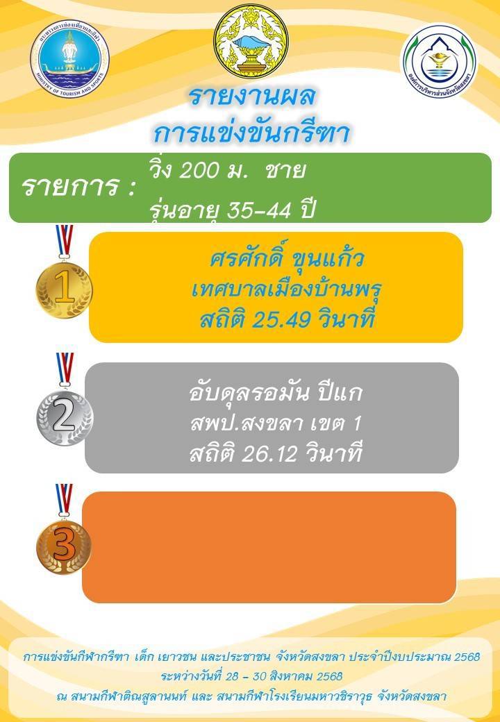 เทศบาลเมืองบ้านพรุ ขอแสดงความยินดี กับ นายศรศักดิ์ ขุนแก้ว และ นายธเนศวร์ แก้วมรกต ในการแข่งขันกีฬากรีฑา เด็ก เยาวชน และประชาชน จังหวัดสงขลา ระหว่างวันที่ 28 – 30 สิงหาคม 2568 ณ. สนามกีฬาติณสูลานนท์ และ สนามกีฬาโรงเรียนมหาวชิราวุธ จังหวัดสงขลา