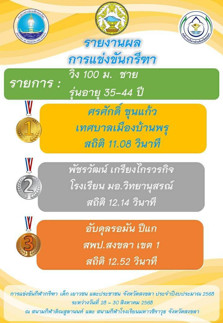🎯 ผลการแข่งขัน วิ่ง 100 ม. ชาย [รุ่นอายุ 35 – 44 ปี]