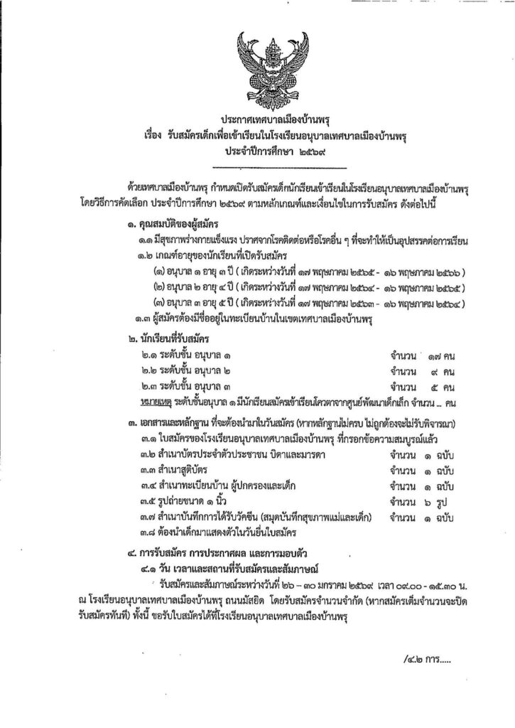 เรื่อง : รับสมัครเด็กเพื่อเข้าเรียนในโรงเรียนอนุบาลเทศบาลเมืองบ้านพรุ
