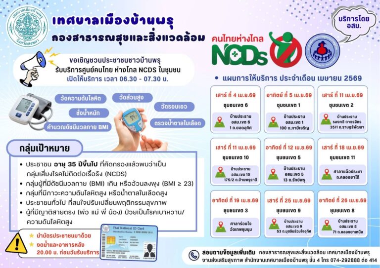 ข่าวประชาสัมพันธ์ ขอเชิญประชาชนชาวบ้านพรุ รับบริการศูนย์คนไทย ห่างไกล NCDS ในชุมชน2 เมษายน 25692 เมษายน 2026